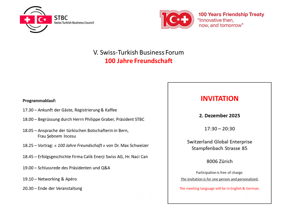 Aus diesem besonderen Anlass organisiert der Swiss Turkish Business Council (STBC) das 5. Schweizerisch-Türkische Wirtschaftsforum (V. Swiss-Turkish Business Forum), das am 2. Dezember 2025 in Zürich stattfinden wird.