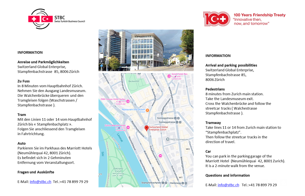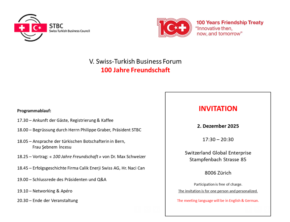 Bu yıl, İsviçre ile Türkiye arasında imzalanan Dostluk Antlaşması’nın 100. yılı büyük bir gurur ve coşkuyla kutlanıyor. Bu özel vesileyle, Swiss Turkish Business Council (STBC) tarafından düzenlenen 5. İsviçre-Türkiye İş Forumu (V. Swiss-Turkish Business Forum), 2 Aralık 2025 tarihinde Zürih’te gerçekleştirilecektir.